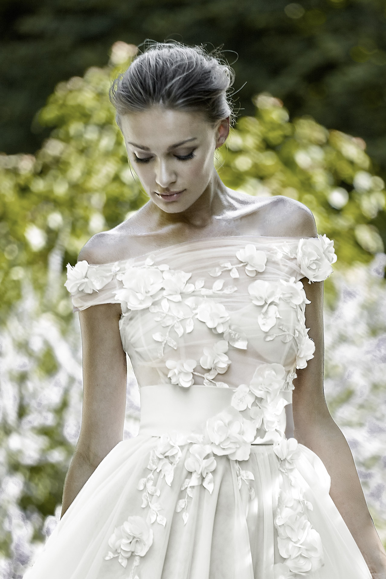 Il tessuto principale dell’abito, un leggerissimo tulle mano seta, avvolge la sposa in una nuvola di morbidezza. Questo tessuto non solo offre una sensazione di leggerezza impareggiabile, ma crea anche un effetto etereo e quasi sospeso nell’aria. La seta, da sempre simbolo di lusso e raffinatezza, contribuisce a donare una lucentezza discreta ma irresistibile, rendendo la sposa la vera protagonista del suo giorno speciale.